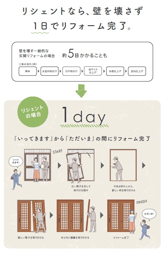 リシェント玄関シリーズの大きな魅力は、壁を壊さずにたった1日で施工が完了する点です。